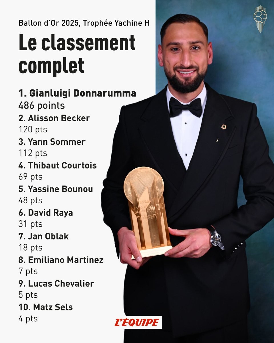 多纳鲁马在2025年雅辛奖的评选中占据绝对优势,他在100名投票记者中有93人将他排在第一位。
